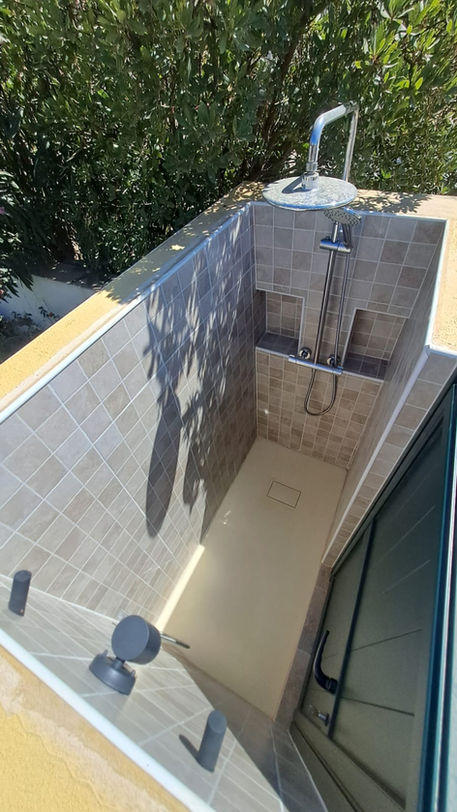 È presente inoltre uno spazioso cortile pavimentato in pietra dotato di doccia esterna con acqua calda, barbecue, tavolo da pranzo con ombrellone e lettini per prendere il sole.